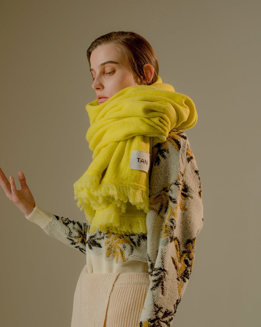 世界で一番細いブークレ糸を採用し、ダブルフェイスで贅沢に編み立て。